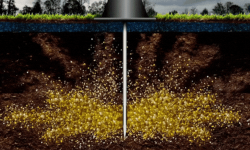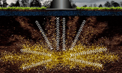 Next, enriched biochar is injected into these new channels. This further loosens the soil while filling the voids with a stable, non-degrading material that allows air and water to move freely through previously compacted zones.