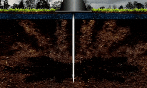 We begin by drilling into the soil to a depth of around 1 meter. High-pressure air (7 bar / 100 psi) is then injected to break apart compacted layers and create channels within the ground.